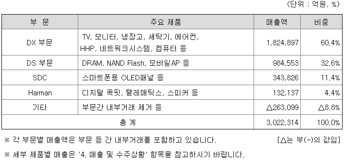 사업별로 보면, Set 사업은 TV를 비롯하여 모니터, 냉장고, 세탁기, 에어컨, HHP(스마트폰 등), 네트워크시스템, 컴퓨터 등을 생산ㆍ판매하는 DX(Device eXperience) 부문이 있으며, 부품 사업에는 DRAM, NAND Flash, 모바일AP 등의 제품을 생산ㆍ판매하고 있는 DS(Device Solutions) 부문과 중소형 OLED 등의 디스플레이 패널(DP)을 생산ㆍ판매하고 있는 SDC가 있습니다. 또한, 2017년에 인수한 Harman에서는 디지털 콕핏(Digital Cockpit), 텔레매틱스(Telematics), 스피커 등을 생산ㆍ판매하고 있습니다.