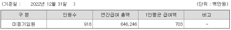 미등기임원의 평균연봉은 7억 300만원이고 직원수는 918명입니다.