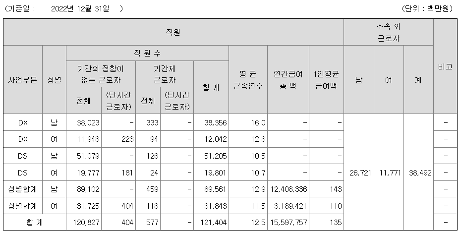 남성의 평균연봉은 1억 4300만원이고 직원수는 89,561명, 여성은 1억 1000만원이고 직원수는 31,843명입니다. 전체 평균연봉은 1억 3500만원이고 직원수는 121,404명입니다.
