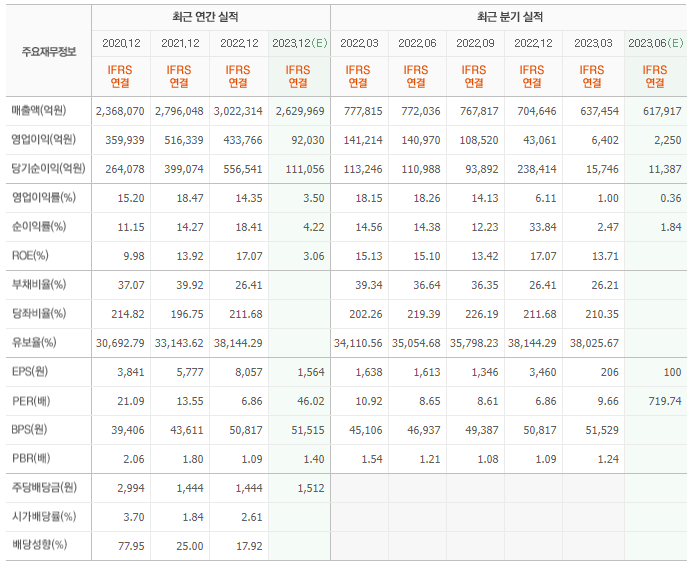 2022년 실적은 302조 2314억, 영업이익은 43조 3766억입니다.