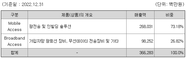 당사는 통신 트래픽을 광선로로 다중화하여 전달하는 광전송 장비 및 Fronthaul 관련 장비, 인빌딩광분산장치(DAS)를 한국, 미국, 일본, 말레이시아 등의 통신사업자에 납품하고 있으며, 5G 무선통신 서비스의 국내 인프라 구축을 위해 5G용 Fronthaul 장비를 개발하여 공급하고 있습니다. 또한 가상화된 기지국 장비 일체를 개발하여 통신사업자뿐만 아니라 특화망 도입을 희망하는 법인고객을 대상으로 영업을 강화하고 있습니다.