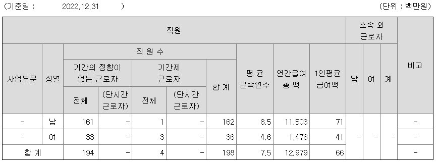 | 사업부문 | 성별 | 직원수 | 평균근속연수 | 평균연봉(백만) |
