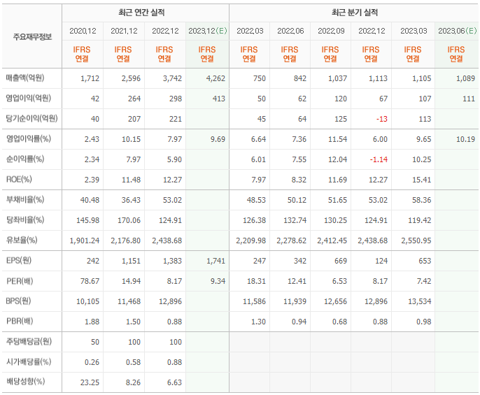 2022년 매출은 3742억, 영업이익은 298억, 당기순이익은 221억입니다. 그리고 영업이익률은 7.97%입니다.