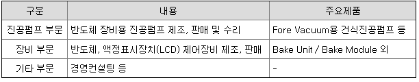 당사는 진공펌프 부문, 장비 부문, 기타 부문으로 구별하고 있으며, 건식진공펌프 사업부문을 주요 사업으로 영위하고 있습니다.