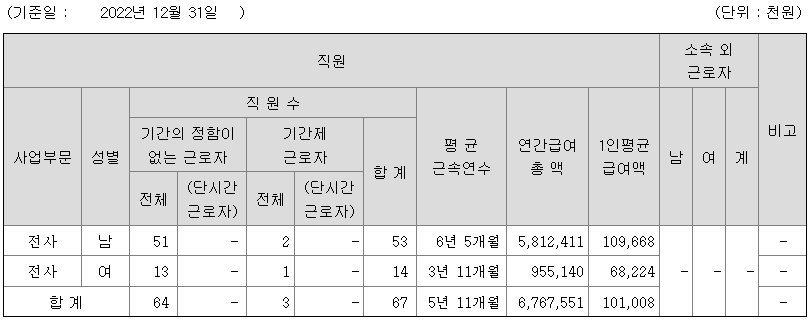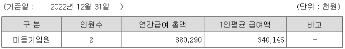 미등기임원의 평균연봉은 3억 4000만원이고 직원수는 2명입니다.