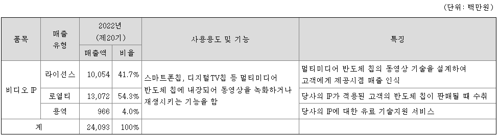 반도체 칩 제조사에 비디오 IP를 라이선스하고, 반도체 칩 회사는 동사의 비디오 기술 및 자체 기술을 활용하여 스마트폰이나 디지털TV 등에 들어가는 반도체 칩을 설계 및 개발합니다.