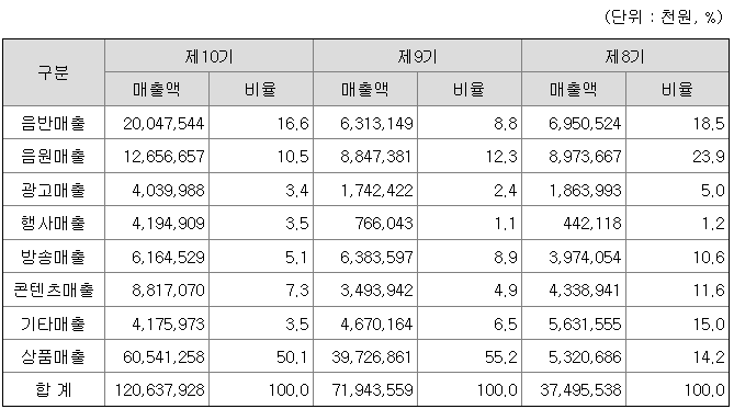 당사는 신인 아티스트를 육성하고 소속 아티스트들의 국/내외 음반 기획, 생산, 홍보, 공연, 매니지먼트, MD 판매 등을 통해 글로벌 K-Pop 열풍을 선도하는 종합 엔터테인먼트 기업이며, 해외의 주요 종속회사 'VT CUBE JAPAN'을 통해 해외 현지 매니지먼트 및 화장품 유통 사업을 영위하고 있습니다. 연결 기준 매출의 경우 창출하는 재화와 용역의 성격 및 시장과 수요자의 특성을 고려하여 사업부문을 구분하고 있으며, 각 부문별 매출액은 아래와 같습니다.