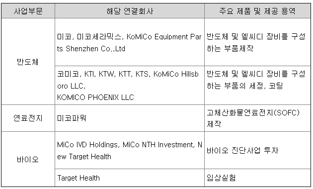 주식회사 미코와 그 종속기업(이하 '연결회사')의 보고부문인 사업부문은 서로 다른 제품과 용역을 제공하는 전략적인 사업단위입니다. 각 사업부문은 서로 다른 기술과 마케팅 전략을 바탕으로 독립적으로 운영되고 있습니다. 연결회사는 2022년 12월 31일 기준으로 영위하고 있는 주된 사업을 기준으로 분류하였으며, 각 사업부문별 주요 제품 및 제공 용역은 다음과 같습니다.