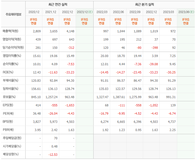 2022년 매출은 4148억, 영업이익은 643억, 당기순이익은 -312억입니다. 그리고 영업이익률은 15.49%입니다.
