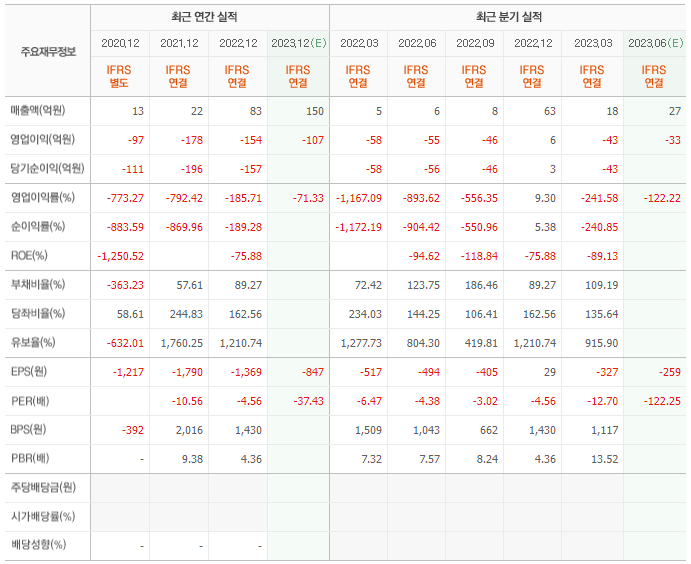 2022년 매출은 83억, 영업이익은 -154억, 당기순이익은 -157억입니다. 그리고 영업이익률은 -185.71%입니다.
