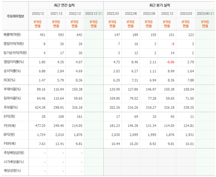 2022년 매출은 642억, 영업이익은 26억, 당기순이익은 30억입니다. 그리고 영업이익률은 4.07%입니다.