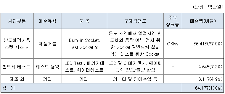 당사는 반도체 검사용 소켓 제조 사업 (BiTS 사업부) 과 반도체 테스트 용역 사업 (반도체 사업부) 을 영위하고 있습니다. 당사는 1998년 설립 이래 국내 최초로 번인 소켓 (Burn-In Socket) 을 개발, 기존 해외 메이커 제품이 독식하고 있던 번인 소켓 시장에 진입하였습니다.