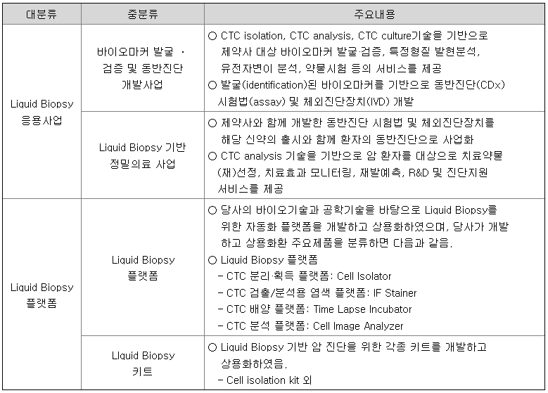 당사는 CTC 기반의 Liquid Biopsy 플랫폼을 기반으로 하여, 제약사 항암 신약개발과정에서의 바이오 서비스 제공 등의 플랫폼 사업과, CTC 기반의 Liquid Biopsy를 이용한 진단 기반의 서비스 및 제품의 개발을 진행하고 있습니다.