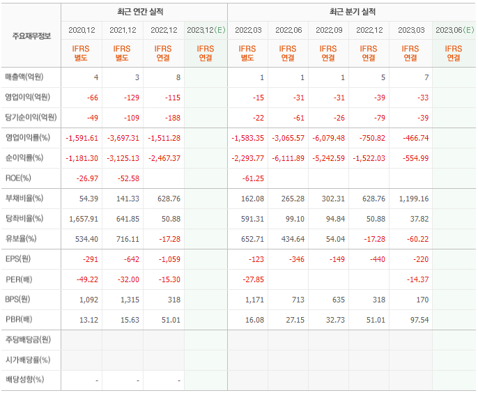 2022년 매출은 8억, 영업이익은 -115억, 당기순이익은 -188억입니다. 그리고 영업이익률은 -1511.28%입니다.