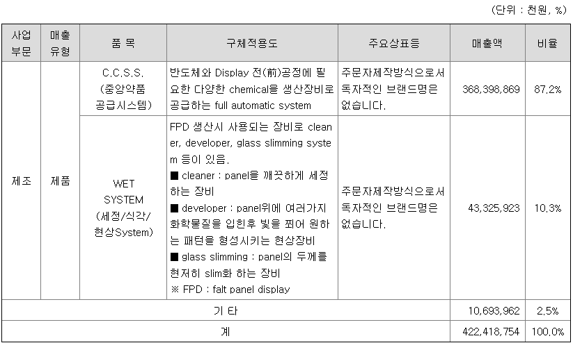 당사의 사업부문은 반도체 및 FPD 장비로 고순도 약액 공급장치인 C.C.S.S.(Central Chemical Supply System) 및 WET System 등이 있으며, 동 제품들을 생산, 공급하고 있습니다. 당사는 C.C.S.S. 등 반도체 서브장비를 넘어 2013년부터 반도체 메인공정장비 시장 진출도 시작했습니다.