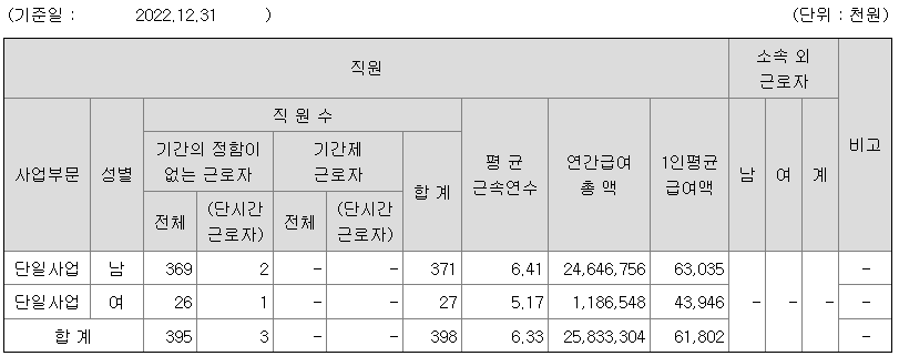 | 사업부문 | 성별 | 직원수 | 평균근속연수 | 평균연봉(백만) |