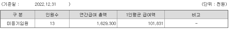 미등기임원의 평균연봉은 1억 100만원이고 직원수는 13명입니다.
