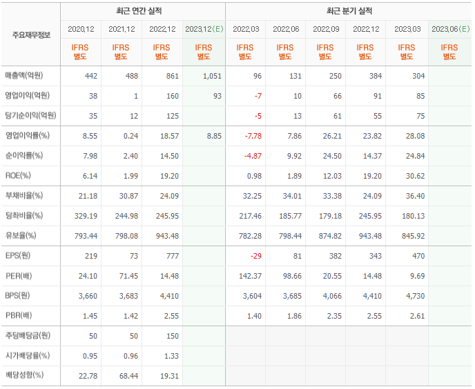 2022년 매출은 861억, 영업이익은 160억, 당기순이익은 125억입니다. 그리고 영업이익률은 18.57%입니다.