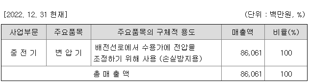 당사는 전압을 조정하기 위해 사용하는 변압기 등을 생산, 판매하고 있으며, 각 부문별 매출액 및 총매출액에서 차지하는 비율은 다음과 같습니다.