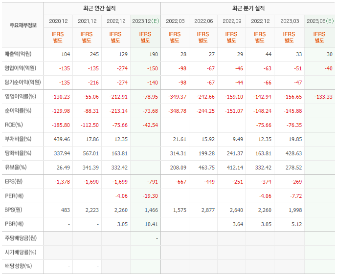 2022년 매출은 129억, 영업이익은 -274억, 당기순이익은 -274억입니다. 그리고 영업이익률은 -212.91%입니다.