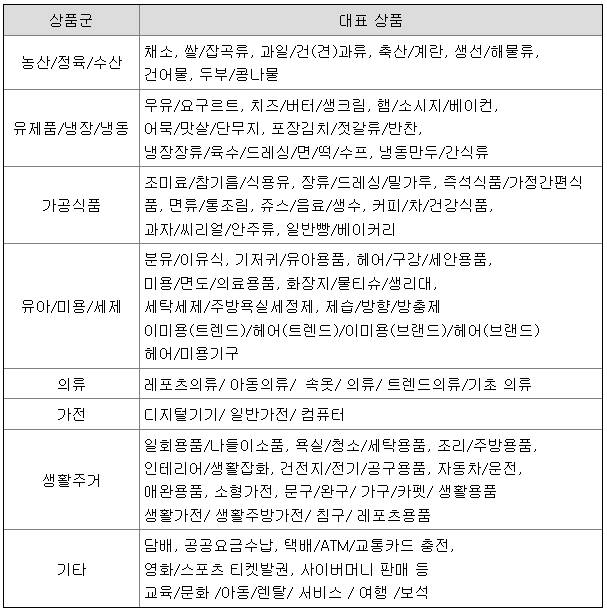당사는 편의점 사업(GS25), 수퍼마켓 사업(GS THE FRESH), 홈쇼핑 사업(GS SHOP, GS MY GS SHOP, Shoppy) 등 기업형 소매유통업을 전문으로 영위하면서, 소비자가 필요로 하는 각종 상품을 판매하고 있습니다. 당사가 주로 판매하고 있는 상품은 다음과 같습니다.