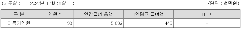 미등기임원의 평균연봉은 4억 4500만원이고 직원수는 33명입니다.