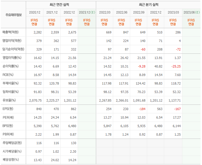 2022년 매출은 2675억, 영업이익은 577억, 당기순이익은 332억입니다. 그리고 영업이익률은 21.56%입니다.