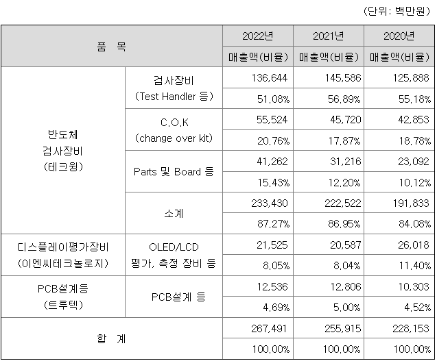 (주)테크윙은 2002년 설립이래 사업확장 및 장비 업그레이드를 통해 지속적인 성장을 해왔습니다. 핵심인 반도체 시험·검사장비에는 반도체 Package Test Handler(Memory, Soc), Burn-in Chamber와 Sorter, Module Test Handler, SSD Test Handler, SSD Burn-in Sorter와 SSD Burn-in Chamber 등 Wafer Burn-in 공정을 제외한 모든 검사공정의 장비를 보유하고 있습니다.