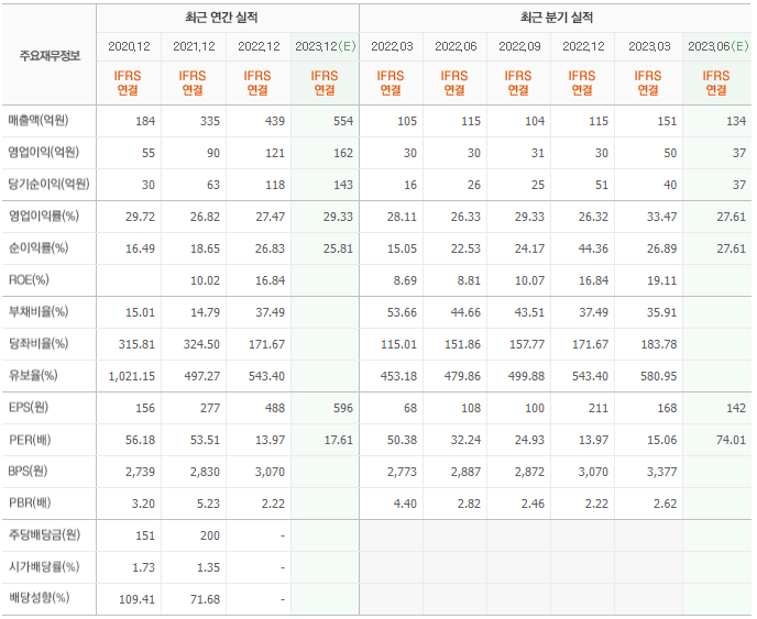 2022년 매출은 439억, 영업이익은 121억, 당기순이익은 118억입니다. 그리고 영업이익률은 24.47%입니다.