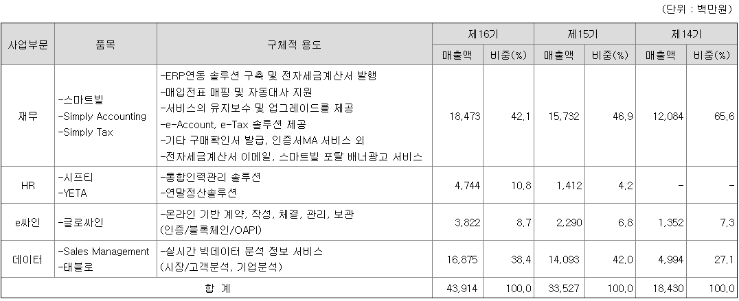 동사는 전자세금계산서 발급 서비스를 기반으로 전자계약, 매입통합, 지능형 빅데이터 등 서비스를 주요 사업으로 영위함.