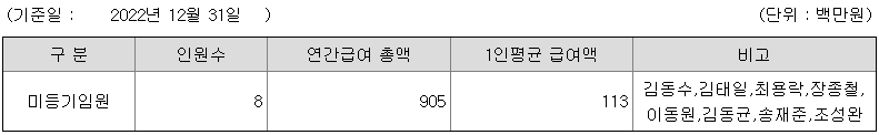 미등기임원의 평균연봉은 1억 1300만원이고 직원수는 8명입니다.