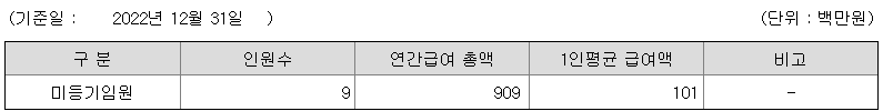 미등기임원의 평균연봉은 1억 100만원이고 직원수는 9명입니다.