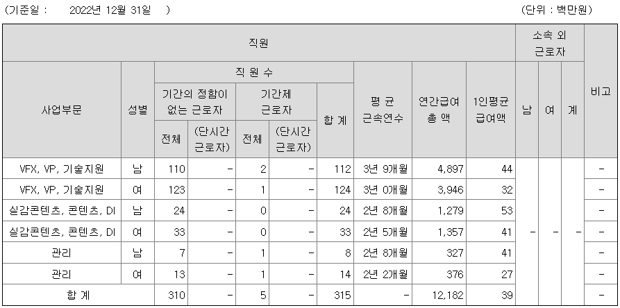 | VFX, VP, 기술지원 | 남 | 112 | 3년 9개월 | 44 |