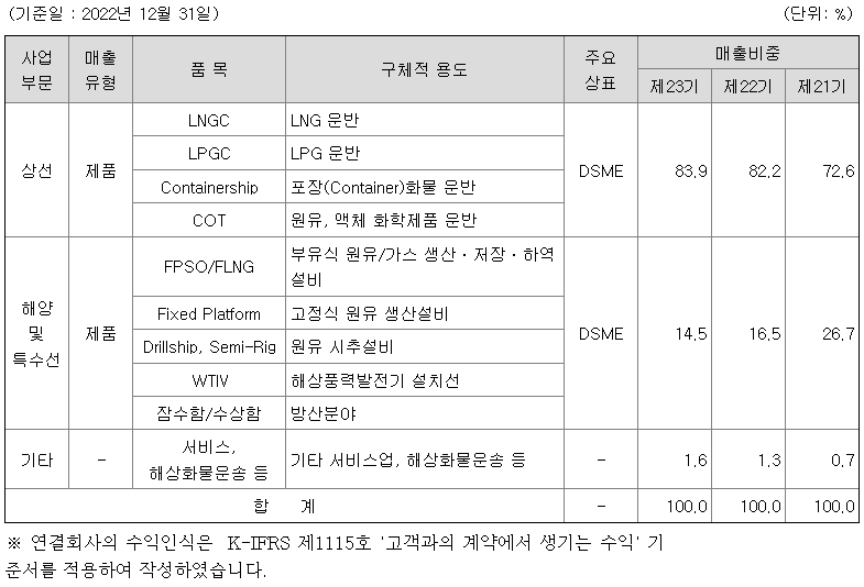 당사는 LNG 운반선, 유조선, 컨테이너선, LPG선 등 각종 선박과 부유식 원유생산 저장 하역설비(FPSO), 고정식 플랫폼(Fixed Platform), 원유 시추설비(RIG, Drillship) 등 해양제품 그리고 잠수함, 구축함, 구난함, 경비함 등 특수선을 건조하는 종합 조선ㆍ해양 전문회사입니다. 당사의 연결대상 주요 종속회사인 대우조선해양(산동)유한공사는 선박블럭 및 부품을 제작하는 회사입니다. 연결대상 종속회사인 디에스엠이정보시스템(주)는 컴퓨터 통합자문 및 시스템 구축사업을 영위하고 있으며, DSME Kazakhstan LLP는 해양프로젝트 계약 관리를 주요 사업으로 영위하는 회사입니다. 또한, DK Maritime S.A.는 해상화물 운송사업을 영위하는 회사입니다.
