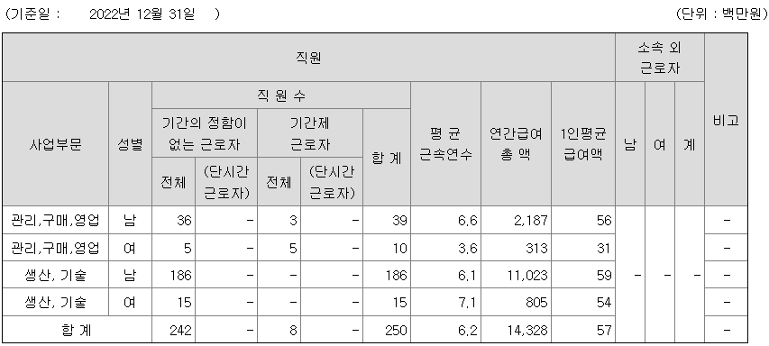 | 사업부문 | 성별 | 직원수 | 평균근속연수 | 평균연봉(백만) |