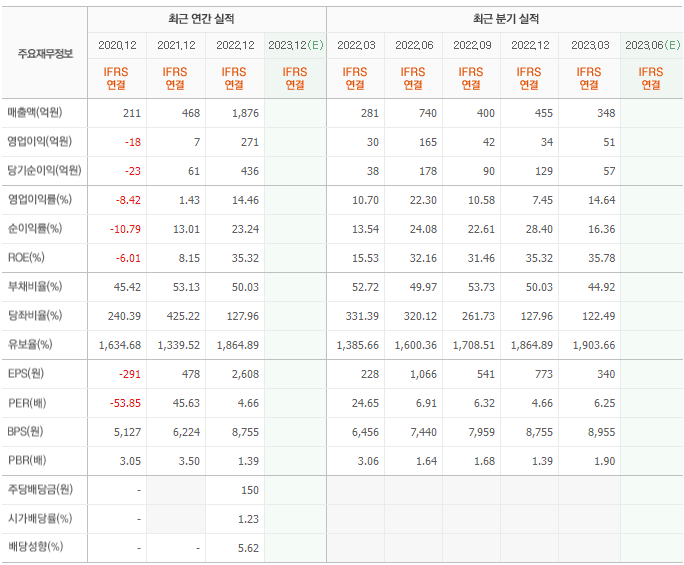 2022년 매출은 1876억, 영업이익은 271억, 당기순이익은 436억입니다. 그리고 영업이익률은 14.46%입니다.