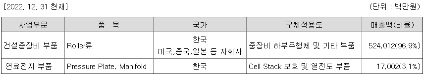 당사의 주요 제품은 건설중장비 등의 무한궤도를 받쳐주는 하부주행체로써 상부 Roller, 하부 Roller, Idler 및 Sprocket 등의 제품을 생산/판매하고 있습니다. 아울러 연료전지 부품인 Pressure Plate, Manifold 등을 생산하고 있습니다.