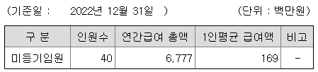 미등기임원의 평균연봉은 1억 6900만원이고 직원수는 40명입니다.