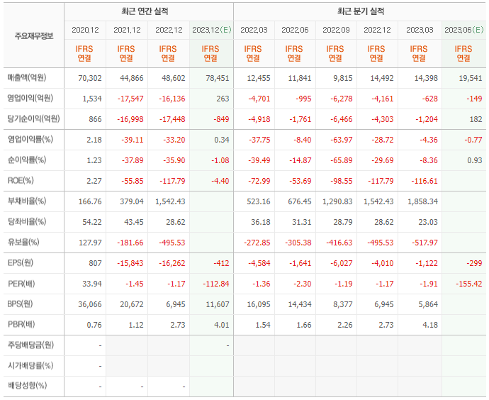 2022년 실적은 4조 8602억, 영업이익은 -1조 6136억입니다. 그리고 영업이익률은 -33.20%입니다.