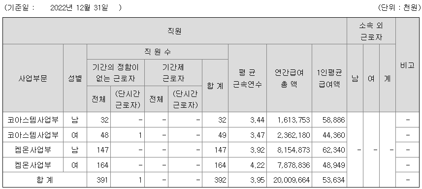 | 코아스템사업부 | 여 | 49 | 3.47 | 44 |