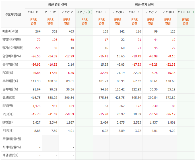 2022년 매출은 463억, 영업이익은 -60억, 당기순이익은 10억입니다. 그리고 영업이익률은 -12.99%입니다.