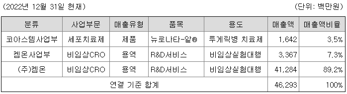 당사는 줄기세포기술을 기반으로 희귀ㆍ난치성질환에 대한 새로운 줄기세포 치료제를 개발, 생산 및 판매를 영위하고 있습니다. 세계적으로 줄기세포치료제의 상용화에 성공하여 2015년 2월 부터 환자에게 투약을 개시하였습니다.