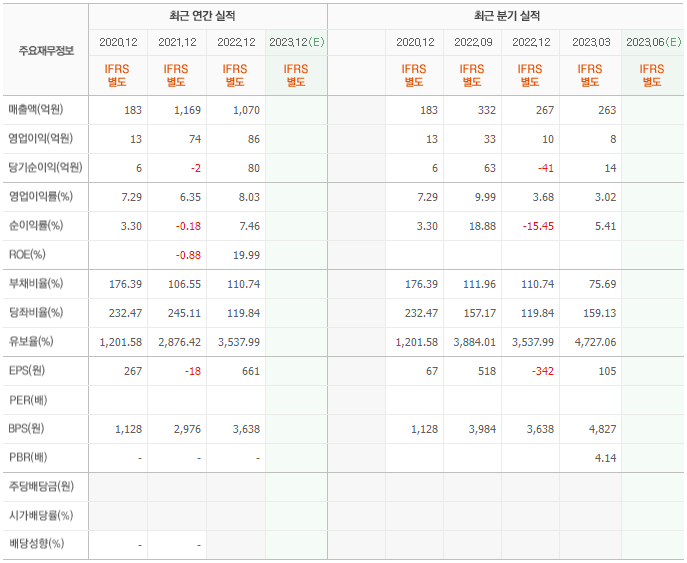 2022년 매출은 1070억, 영업이익은 86억, 당기순이익은 80억입니다. 그리고 영업이익률은 8.03%입니다.