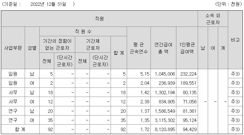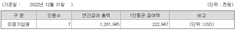 미등기임원의 평균연봉은 2억 2200만원이고 직원수는 7명입니다.