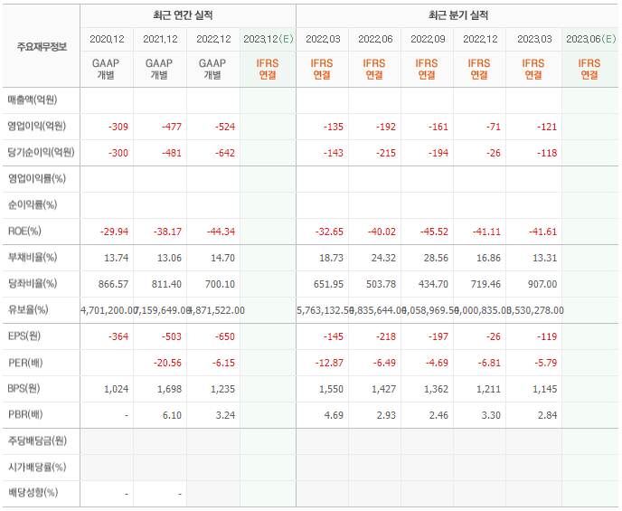 2022년 매출은 -억, 영업이익은 -524억, 당기순이익은 -642억입니다. 그리고 영업이익률은 -%입니다.