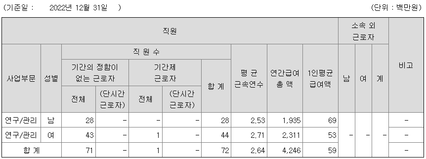 미등기임원의 평균연봉은 1억 4000만원이고 직원수는 2명입니다.