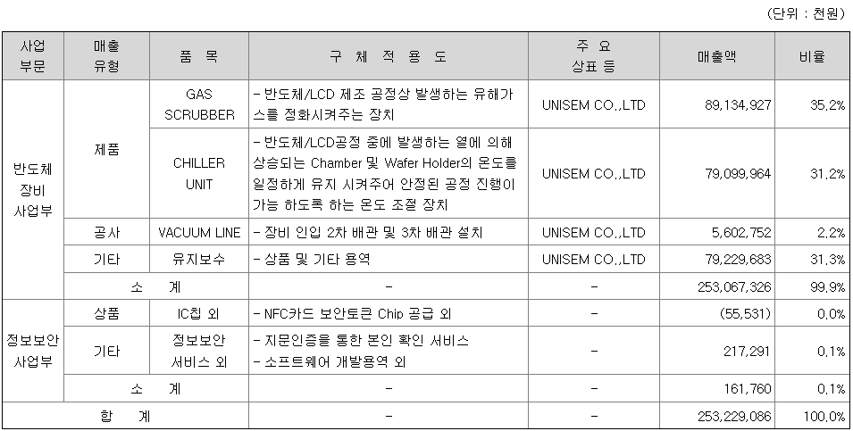 당사는 반도체/디스플레이 장비 전문기업으로 우수한 연구인력 및 기술력을 확보하여 반도체 장비, 디스플레이 장비, 태양광 장비 등을 제작, 판매 및 A/S를 제공하고 있습니다. 주력 생산품목으로는 반도체/디스플레이 제조 공정상 발생되는 유해가스 정화장치인 스크러버(Scrubber), 반도체 Main 공정상 안정적인 온도 유지를 제공하는 온도조절 장치인 칠러(Chiller)를 주요사업으로 영위하고 있습니다.