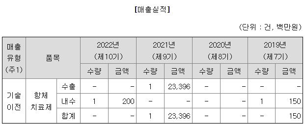 설립 이후 보고서 작성기준일 현재 당사의 매출은 100% 신약 후보물질 기술이전에서 발생하였습니다. 당사는 설립 이후 총 4건의 신약 후보물질의 기술이전 계약을 체결하였으며, 보고서 작성기준일 직전인 2021년 10월에는 덴마크 소재의 신경질환 전문 글로벌 제약사인 룬드벡(H. Lundbeck A/S)에 4억 4천 8백만 달러 규모의 기술이전 계약을 체결하였습니다.