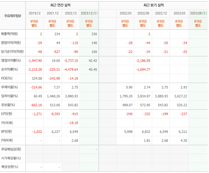 2022년 매출은 2억, 영업이익은 -115억, 당기순이익은 -90억입니다. 그리고 영업이익률은 -5737.15%입니다.