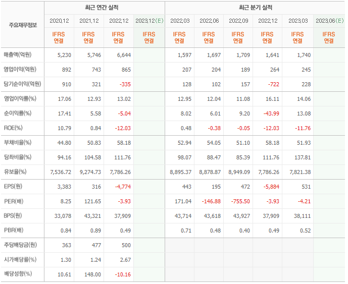 2022년 매출은 6644억, 영업이익은 865억, 당기순이익은 -335억입니다. 그리고 영업이익률은 13.02%입니다.